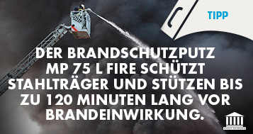 Bereits ab 11mm Dicke kann mit MP 75 L Fire auf Stahlträgern und Stützen eine Feuerwiderstandsklasse von 90 Minuten erreicht werden. Und das direkt auf dem rostgeschützem Stahlträger – ohne Putzträger oder Haftvermittler!
